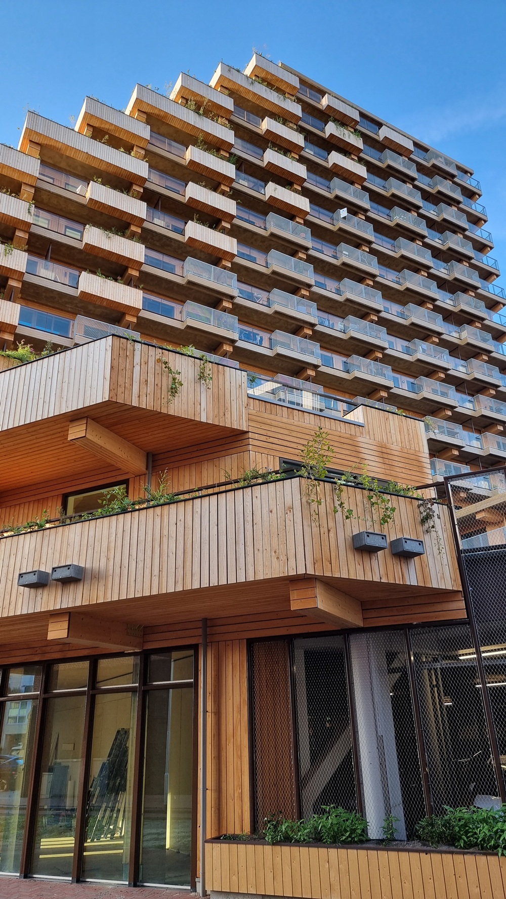 Clădirea a fost dată recent în folosință, cu primii locuitori deja mutați în apartamentele lor din lemn. Am venit să vedem cum arată finalizat acest proiect despre care am citit mult în ultima perioadă. Materialele publicate, interviurile și documentația SAWA au creat un buzz considerabil în lumea arhitecturii și a construcțiilor sustenabile, și acum, în sfârșit, pot vedea cu ochii mei rezultatul.