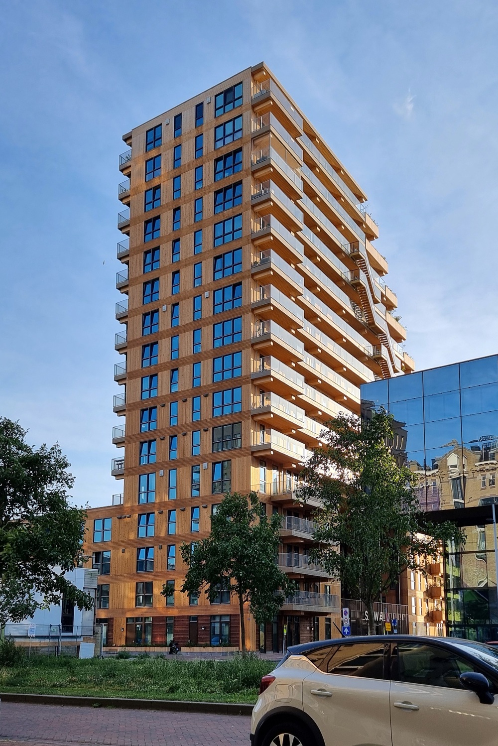 SAWA este prima clădire rezidențială înaltă din Rotterdam construită preponderent din lemn. Dar ce înseamnă asta în practică? Cu excepția fundației, a subsolului și a nucleului central (care adăpostește lifturile și casa scării), întreaga structură portantă este realizată din lemn. Grinzi, coloane, podele – toate sunt realizate din CLT și glulam.