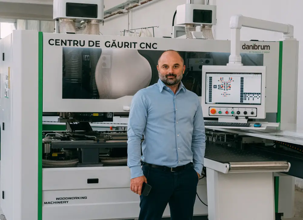 În noul sediu Danibrum din Comănești, unde showroom-ul de 1400 de metri pătrați găzduiește o gamă impresionantă de utilaje pentru prelucrarea lemnului, Mihai Vatavu se gândește că anul 2025 este unul al realizărilor. Este managerul companiei românești care și-a făcut loc pe scena internațională, expunând anul acesta la Ligna și acum pregătește lansarea unui CNC modular, construit să crească odată cu afacerea clientului.