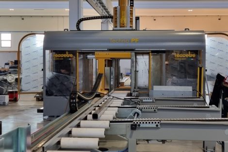 Techno PF 1250 EVO ist das patentierte CNC-Bearbeitungszentrum von Essetre, das für Träger und Platten mit einer Breite von bis zu 1300 mm und modularen Längen - von 13-14 Metern in der typischen Konfiguration bis zu 24 Metern auf Anfrage - ausgelegt ist.