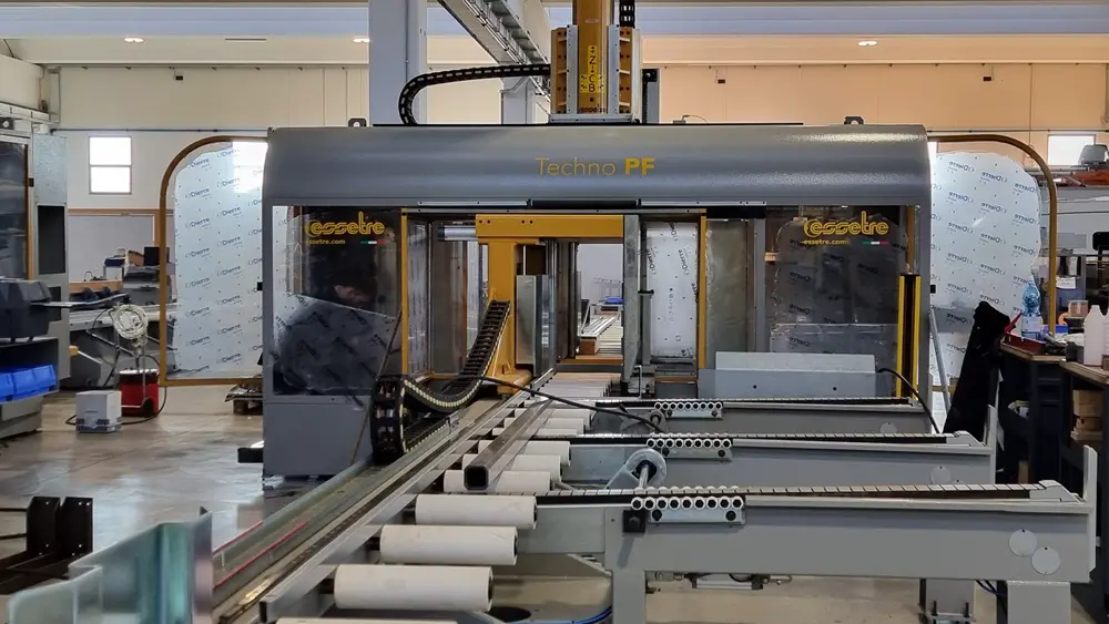 Techno PF 1250 EVO ist das patentierte CNC-Bearbeitungszentrum von Essetre, das für Träger und Platten mit einer Breite von bis zu 1300 mm und modularen Längen - von 13-14 Metern in der typischen Konfiguration bis zu 24 Metern auf Anfrage - ausgelegt ist.