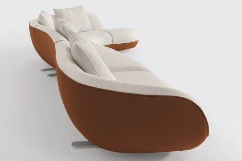 CALIA ITALY (Pavilion 15) did this with the model Choco Magic, a re-edition of the Magic model created by Liborio V. Calia in 1984. The new model retains the elements that made the original such a success - the eye-catching 70s-inspired design and excellent comfort - but gets fresh details. "Choco Magic is distinguished by its elegant arm that reaches all the way to the floor"explains the manufacturer. "To ensure maximum comfort, the soft, soap-shaped seat cushions sit on a slightly sloping base." An interesting detail is the headrest, which can be adjusted by hand with a simple movement without the use of metal mechanisms.