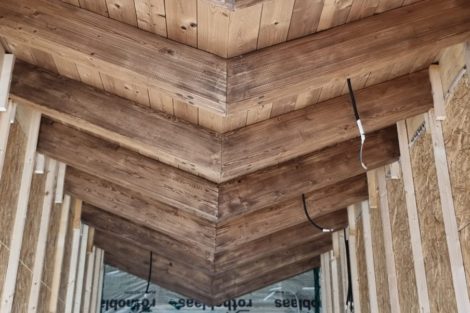 The processing of the headers in the Dorna Eco House factory, on CNC machines, allowed for precise joints and details that, once installed, become an integral part of the interior design. The structure is no longer hidden but exposed and enhanced.