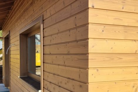 The ventilated facade, insulated with high-density basalt wool, is clad with heat-treated pine. The installation without masking battens at the corners emphasizes the precision of the workmanship and the quality of the finish.