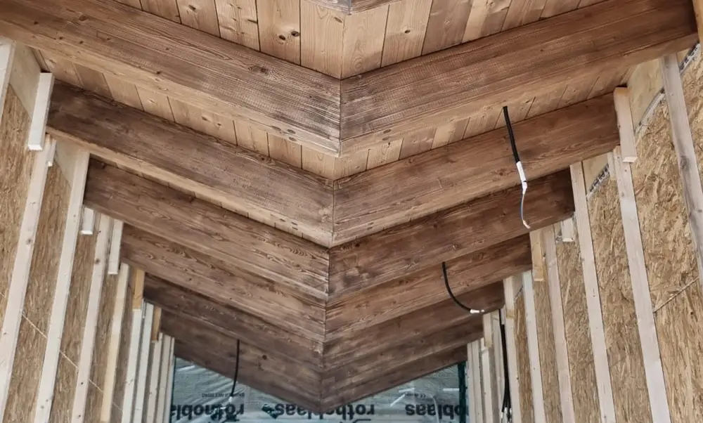 The processing of the headers in the Dorna Eco House factory, on CNC machines, allowed for precise joints and details that, once installed, become an integral part of the interior design. The structure is no longer hidden but exposed and enhanced.