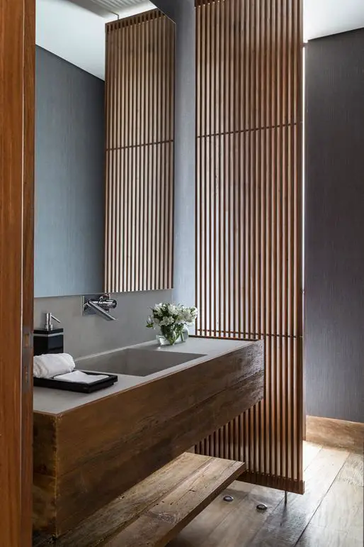 Cele moderne au de obicei design minimalist. Lemnul este folosit pentru pardoseli, pentru placarea pereților sau a căzilor, dar și pentru realizarea unor pereți despărțitori. Sunt folosite chiuvete sau căzi de baie din lemn, sau se folosește lemnul ca suport pentru chiuvete. Din lemn se pot face și polițele pentru cosmetice. Pentru a crea o atmosferă deosebită, băile sunt decorate cu flori și plante decorative, pietre albe sau colorate, tablouri sau spoturi luminoase.