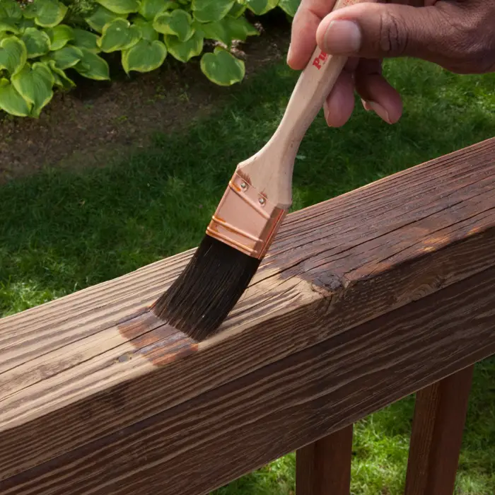 2. În primul rând trebuie să folosiți un baiț pentru exterior, rezistent la razele soarelui. Cel mai bine ar fi să folosiți un impregnant cerat pentru exterior sau lazură colorată pe bază de ulei sau apă. Eu aș folosi lazură colorată pe bază de ulei. O variantă foarte rezistentă găsiți aici. Uleiul sau ceara va face apa să alunece. De asemenea, toate aceste materiale au un efect de uniformizare astfel încât diferența dintre lemnul vechi și cel nou va fi atenuată.