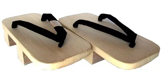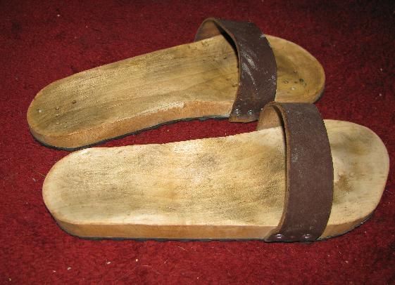 Papuci cu talpă de lemn purtau și oamenii de la țară când eram eu mică. Îmi amintesc că eram vara, în vacanță, la țară și împreună cu verii mei mai mari ne făceam papuci din lemn. Le spuneam galenți. Erau niște tălpi din lemn tăiate după forma labei piciorului, care în față aveau o bucată de piele prinsă cu ținte. Erau pereche, pentru piciorul drept și pentru cel stâng, nu universali ca cei japonezi. Semănau cu cei din imaginea de mai jos. Fiind rigizi era destul de greu de mers cu ei și te și auzeai de departe pentru că bocăneau îngrozitor ☺.