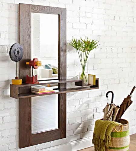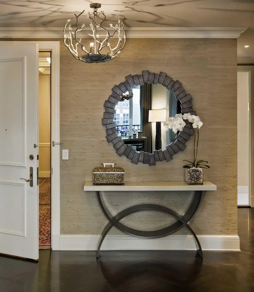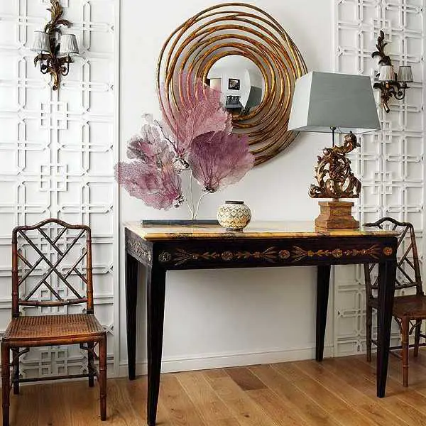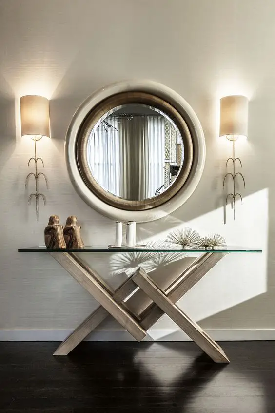 Combinația dintre măsuța modernă sau clasică de perete și oglinda de deasupra este foarte des întâlnită în decorarea interioarelor. Asortând finisajul mesei cu cel al ramei oglinzii se poate amenaja un loc frumos, util și elegant, la intrare, în living sau în alt colț al casei.