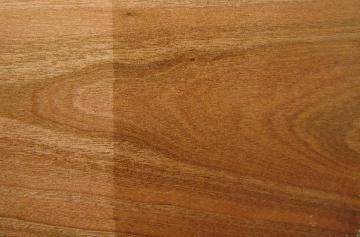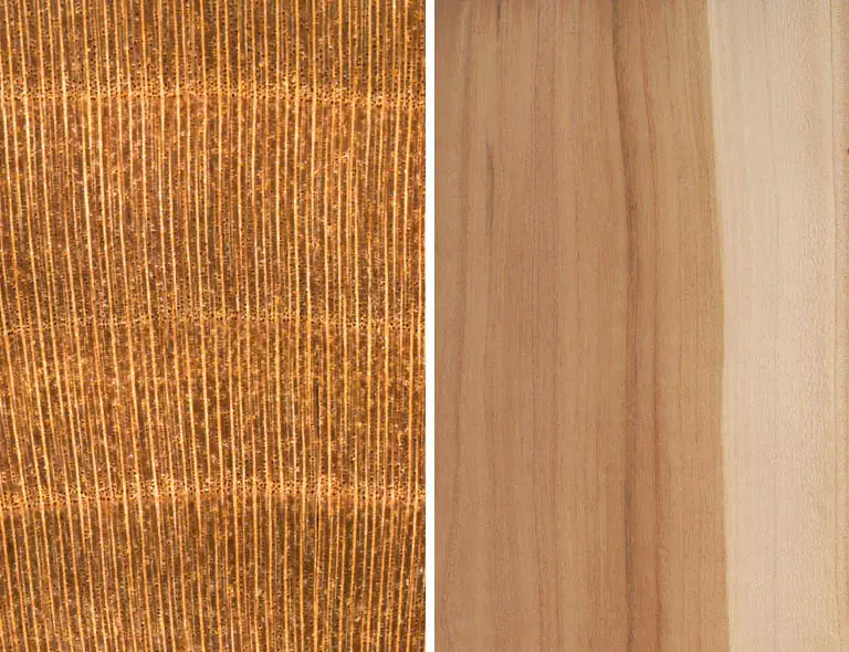 Textura este fină, densă, uniformă, cu fibra dreaptă sau ușor ondulată și luciu natural moderat. Porii sunt mici, ușor argintii, semirotunzi, așezați fără un model anume. Uneori sunt prezente gume în lemn. Inelele anuale sunt distincte datorită concentrării porilor în zona de lemn timpuriu. Razele medulare sunt fine, dar vizibile cu ochiul liber. În secțiune radială apar uneori dungi roz-verzui sau violacee.