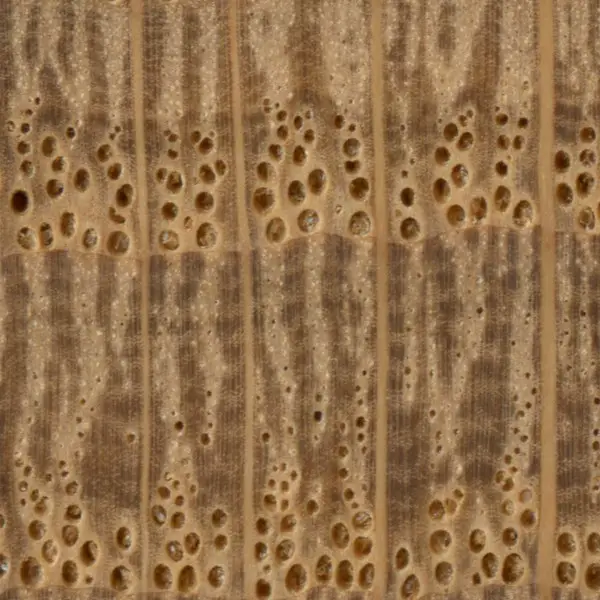 Porii sunt foarte distincți și rotunzi. În lemnul timpuriu sunt mai mari și mai rari, iar în cel târziu mai mulți și deși. Desenul format de pori, mai ales la tăierea tangențială, este caracteristic și reprezintă un element de recunoaștere a lemnului de stejar. Raze medulare sunt mari, vizibile, sub formă de panglică care formează oglinzi pe suprafața lemnului. Fibra are aspect dur, rugos și uneori poate fi neregulată sau răsucită, din cauza condițiilor de creștere.