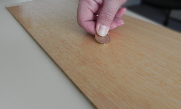 Dacă în urmă nu rămâne o urmă albă sau stratul de lac nu este “rașchetat”, atunci aderența este bună. Practic în spatele monedei nu trebuie să rămână nici o urmă. De obicei, după ce se trece cu moneda, suprafa,a este ștearsă cu o carpă moale pentru a vedea mai bine urmele.