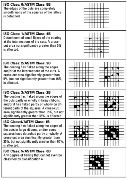 În funcție de cât lac rămâne pe bucata de scotch se determină calitatea aderenței. În varianta standardizată există o împărțire în mai multe categorii – aderență foarte bună, bună, acceptabilă sau nu are aderență, iar clasificarea se face comparând grila din standard cu rezultatul obținut.