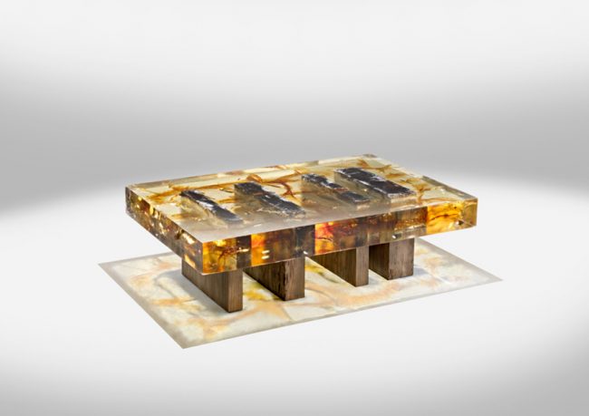 Vă spuneam la început despre designerii care creează obiecte deosebite cu ajutorul rășinii epoxidice. Poate cele mai reușite dintre ele sunt cele în care rășina este combinată cu lemnul recuperat. Efectele trecerii timpului sau urmările atacului insectelor sunt evidențiate de rășină. Rezultatul, din punctul meu de vedere, este minunat.