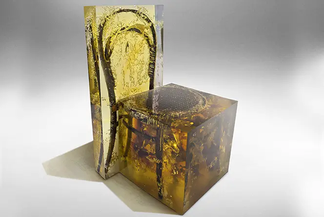 Am remarcat și o altă modă – încastrarea unui obiect simplu de mobilier, în general un scaun, într-un cub de rășină. Piesa obținută prin încastrarea unui scaun Thonet este chiar spectaculos.