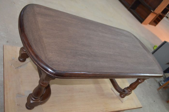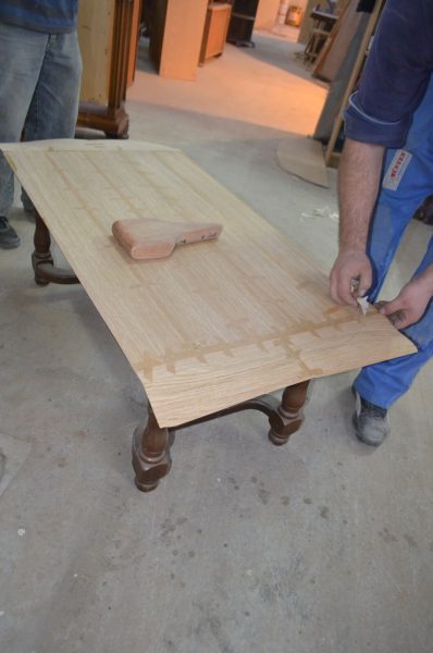 Pot apărea situații, ca cel al mesei din fotografii, când defectele sunt foarte mari și atunci este necesară furniruirea blatului. În acest caz vă sfătuiesc să apelați la specialiști pentru că nu este un lucru simplu de făcut. Foile de furnir trebuie împerecheate și prinse între ele cu hârtie adezivă pentru a crea modelul dorit, după care se decupează după dimensiunile mesei. Furnirul astfel obținut se prinde de blat prin încleiere. Operațiunea trebuie făcută cu mare grijă pentru a nu rămâne aer sau impurități între placă și furnir. Dacă bucățile de furnir nu sunt bine prinse ele pot aluneca la lipire și operațiunea este compromisă total. Repet, furniruirea nu este simplă, iar sfatul meu în acest caz este să apelați la specialiști.