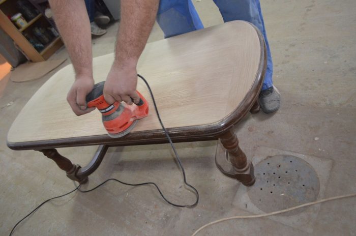 Dar să revenim la cazul când nu este necesară furniruirea iar blatul a fost curățat foarte bine și șlefuit. Ar trebui să urmeze colorarea. Înainte însă trebuie șlefuite și celelalte părți ale mesei (picioarele, legăturile), pentru a încheia operațiunile care generează praf. Praful, asa cum spun mereu, este dușmanul finisajului și este bine să eliminați orice sursă înainte să începeți să colorați și să lăcuiți.