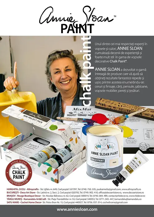 Pentru cei ca mine, pasionați de mobila cu aspect învechit, de artă și design înglobată într-o mică piesă de mobilier, Annie Sloan este cu siguranță un reper. Dacă veți căuta pe net mobilă îmbătrânită, distressed, rustic chic, sau alte astfel de stiluri, este imposibil să nu dați și peste cel puțin un obiect de mobilier finisat cu vopsele Annie Sloan. Este o persoană creativă care a devenit un brand cunoscut în toată lumea. Firea și pregătirea ei artistică, imposibilitatea de a găsi materialele care să-i permită să transforme o mobilă sau un interior așa cum și-ar fi dorit, a determinat-o să creeze propria linie de produse. Produsele au convins foarte repede și au cucerit lumea. Drept consecință, ne-au cucerit și pe noi.