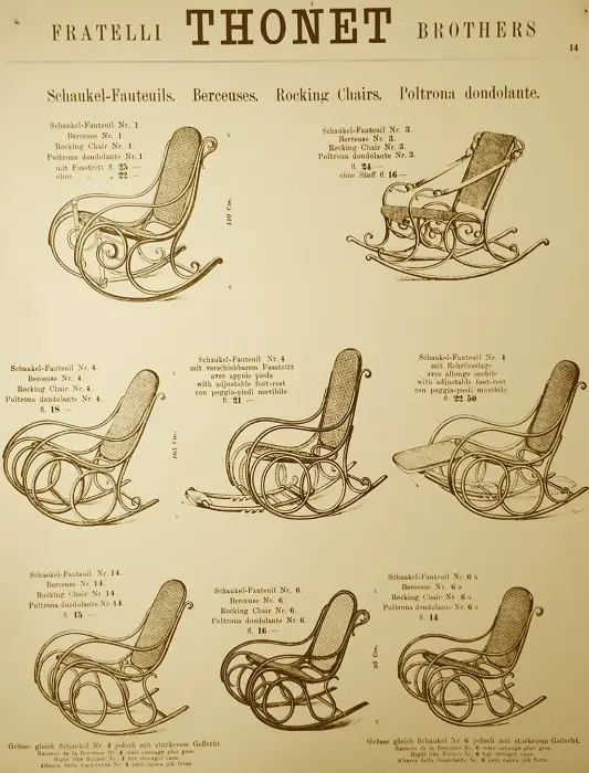 Ca an de naștere este considerat 1860, fără să existe un document clar care să indice anul. Numai că, despre scaunul Thonet nr 14 se știe ca a fost primul scaun făcut cu elemente curbate și a ajuns la forma finală în 1859. Fabrica înființată de Thonet împreună cu cei 4 fii ai săi a început să producă mobilier la un nivel industrial, el făcând mobila accesibilă si clasei de mijloc, nu numai cele privilegiate. Ajungând la producții din ce în ce mai mari și modele din ce în ce mai variate, în 1883 Thonet editează primul catalog de mobilă ce conținea 21 de pagini și 219 modele. Catalogul este urmat destul de repede de cel de-al doilea, în 1886 și al treilea, în 1888, ce avea 30 de pagini și 339 de modele. Cu ajutorul acestor cataloage au reușit istoricii să fixeze ca an de fabricație pentru balansoar 1860.