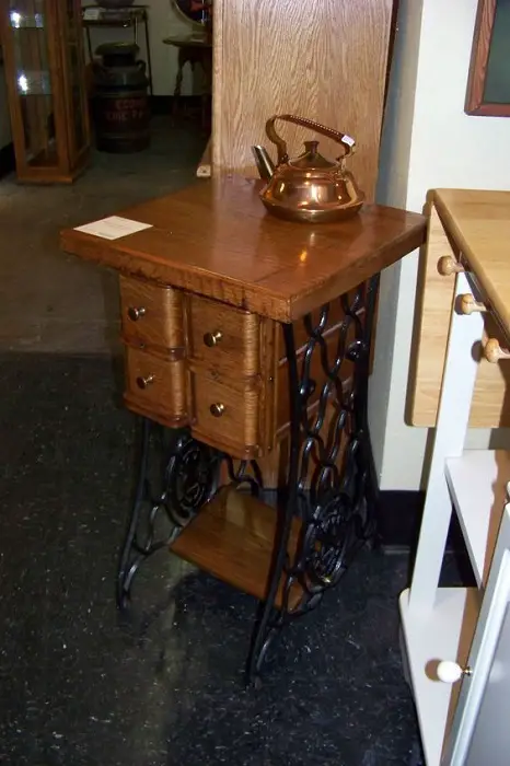 Ceea ce nu se mai folosește de la o veche mașină de cusut este chiar dispozitivul de coasere. Așa că, îndepărtându-l ea devine o masă în sine. Suportul metalic poate fi folosit așa cum este, iar în locul blatului inițial de deasupra se poate pune un blat gros de lemn, făcut din scândură netivită pentru un aspect rustic. Masa obținută din adăugarea elementelor noi la cele care mai pot fi păstrate, va continua să fie utilă și trainică.