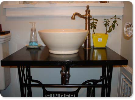 Tot din vechea mașină de cusut se poate face un suport pentru chiuveta de la baie. Poate fi folosită înlăturând doar dispozitivul de cusut sau numai piciorul, partea de sprijin. Avantajul în primul caz este că pot fi folosite sertarele pentru depozitare, dar instalarea va fi mai dificilă. În al doilea caz instalarea este mult mai simplă, putând fi folosit orice fel de blat – lemn, sticlă, blat special rezistent la umiditate. Dacă vă hotărâți să faceți o astfel de transformare nu uitați că lacul folosit pentru finisarea lemnului trebuie să fie rezistent la umiditate.