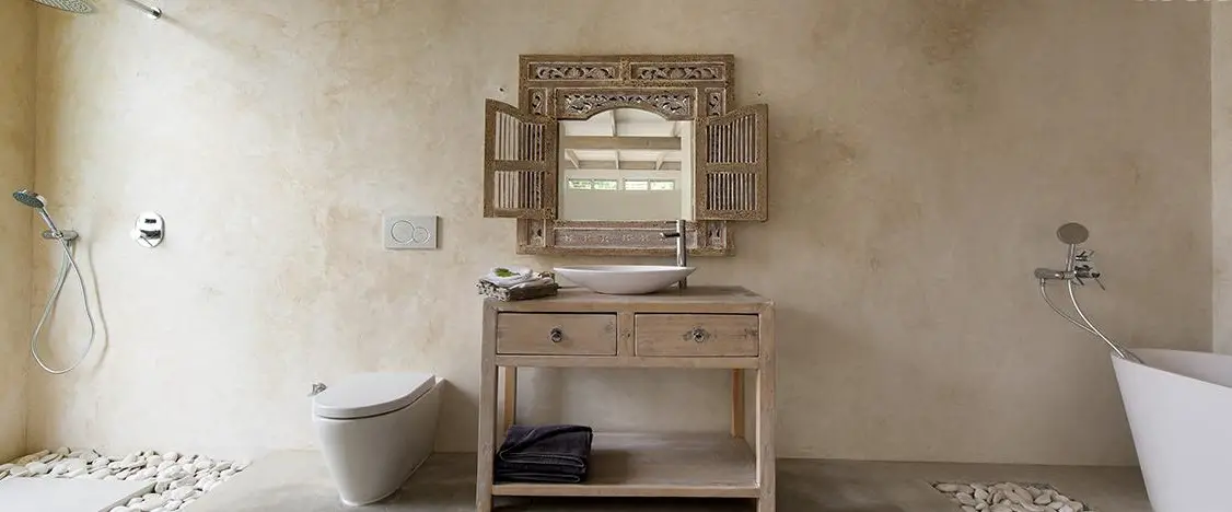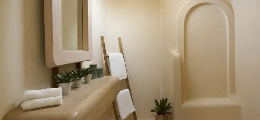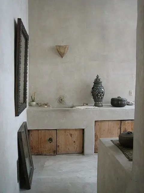 Zilele trecute mă documentam și am dat peste fotografia de mai jos. M-a atras în primul rând atmosfera de foarte vechi creată în ciuda dotărilor moderne, modul în care fusese finisat lemnul pentru a se încadra în atmosferă și am hotărât să aflu mai multe despre modul cum fusese realizat acel decor. De atunci sunt ca în transă. Sunt zile de când citesc continuu, vorbesc cu toată lumea, urmăresc tutoriale, deslușesc tehnici. Și culmea, nu este vorba despre lemn, pasiunea mea de-o viață, ci despre o tencuială tradițională marocană, veche de când lumea. Se numește Tadelakt și am aflat atât de multe lucruri interesante despre ea că simt nevoia să vă spun și vouă, mai ales că este o tencuială naturală și, cu ceva pregătire, o puteți realiza și singuri. Știu că nu este despre lemn, dar aveți încredere, o să vă placă. Plus că se combină perfect cu lemnul.