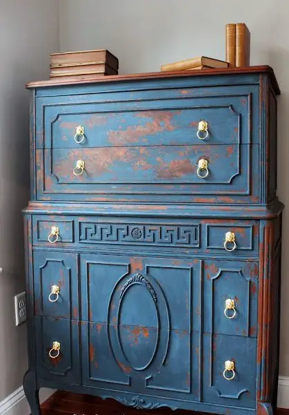 - dacă sunteți adepții mobilei cu aspect învechit folosiți pentru schimbare straturi succesive de culori diferite. Nu vă dați silința ca straturile să fie aplicate perfect, dar nu aplicați stratul următor până când primul nu este complet uscat. În caz contrar vopselele se vor amesteca și efectul va fi diferit. Dacă vreți să se vadă și mai bine stratul inferior îndepărtați-l pe cel de deasupra prin șlefuire. Efectul se numește distressed;