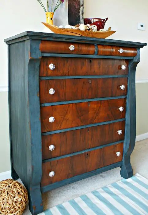 - în cazul comodelor cu sertare puteți alege să vopsiți numai cadrul, sertarele rămânând neschimbate. Este un mod prin care se pune și mai mult în evidență desenul unui lemn frumos.