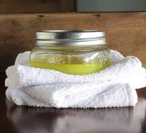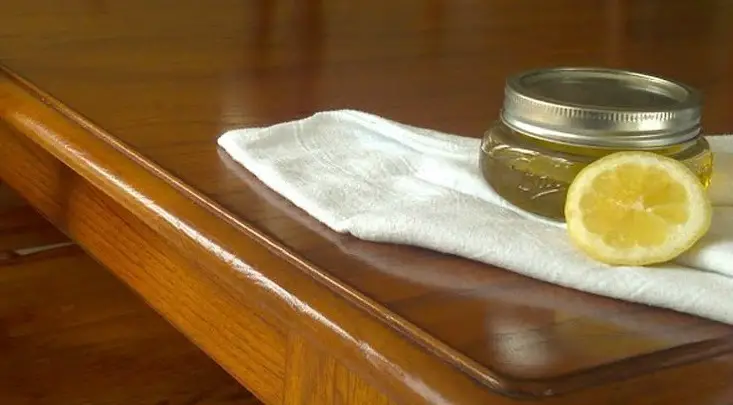 Pentru a proteja mobilierul și a-i reda frumusețea inițială, după ce l-ați curățat cu apă și detergent puteți folosi în loc de ceară o soluție pe care să o faceți singuri. Amestecați 3/4 ceașcă de ulei de măsline cu 1/4 ceașcă de oțet din vin alb și o linguriță de zeamă de lămâie. Puneți totul într-un borcan cu capac și agitați bine. Aplicați soluția pe mobilă cu ajutorul unei cârpe de bumbac, lustruind ușor. Soluția are avantajul că estompează urmele albe sau zgârieturile.