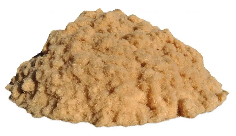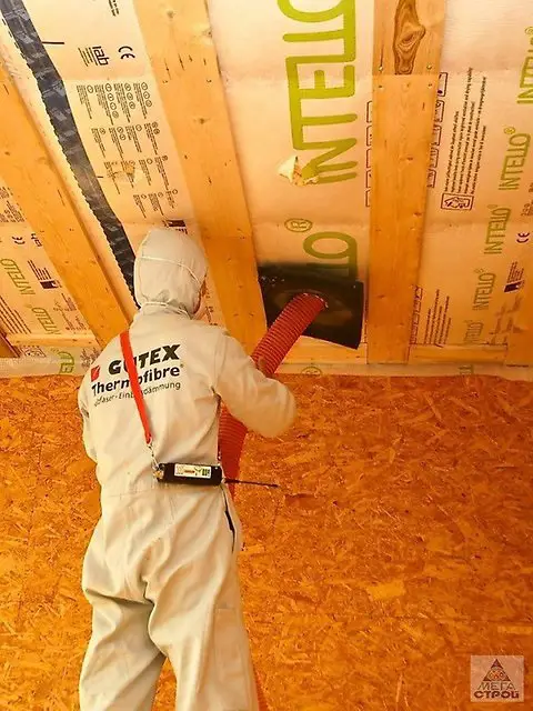Dar ce sunt aceste fibre? Sunt obținute tot prin procedeul de delignificare parțială a lemnului, ca și în cazul plăcilor fibrolemnoase, dar nu mai sunt procesate pentru a forma plăci ci sunt lăsate ca niște smocuri de lână sau vată. În cazul de mai sus s-a folosit Gutex Thermofibre. Aceste fibre sunt obținute din lemn de brad și molid și sunt amestecate în proporție de 5% cu săruri de amoniu, pentru a împiedica propagarea focului în caz de incendiu. Sunt mici și flexibile și pot pătrunde cu ușurință în orice colțișor, creând o barieră izolatoare.