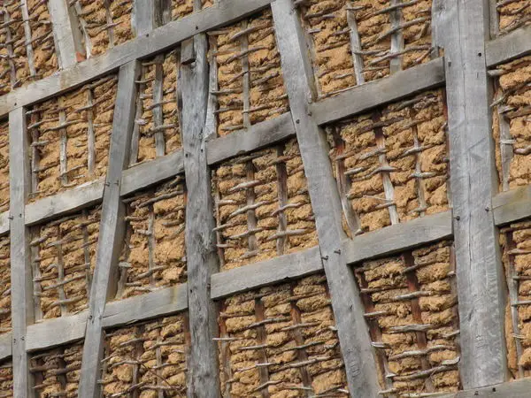Pentru a avea o structură solidă fiecare pătrat sau dreptunghi format de grinzile verticale și orizontale este întărit cu grinzi oblice care unesc ungiurile opuse. De-o parte și de alta a grinzilor verticale, adică la exteriorul și la interiorul casei, se bat șipci orizontale din lemn cu pauză între ele. Se formează astfel un fel de perete gol care ulterior va fi umplut la interior cu lut amestecat cu paie.