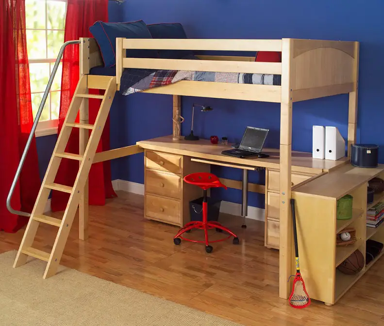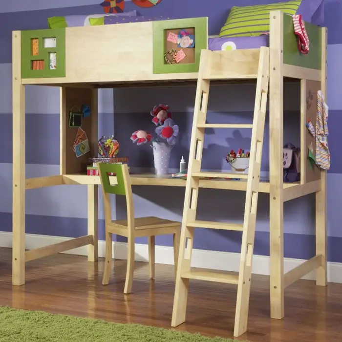 Și în această situație soluția este tot folosirea spațiului pe verticală. Pe modelul paturilor suprapuse, în locul patului de jos este amenajat locul pentru studiu, iar patul de sus este poziționat în așa fel încât să nu deranjeze copilul când stă la birou. Este o soluție bună pentru case, care de obicei sunt mai înalte, dar mai dificil de adaptat în apartament.