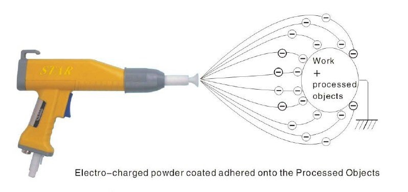 Pulverizarea în câmp electrostatic se bazează pe mișcarea particulelor fine de lac de-a lungul liniilor unui câmp electromagnetic format între pistolul încărcat cu sarcini negative și obiectul din lemn încărcat cu sarcini pozitive. Particulele de lac încărcate electric sunt atrase spre obiect după liniile de forță ale acestui câmp, cedează sarcina electrică și sunt reținute pe suprafața. Obiectul este legat la pământ astfel încât sarcina electrică se descarcă în pământ și nu există pericolul de electrocutare.