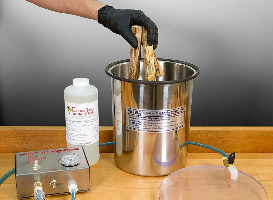 În SUA există un astfel de produs – Cactus Juice – folosit foarte mult pentru impregnarea lemnului. Din câte am reușit să-mi dau seama produsul este un fel de sticlă plexi sub formă lichidă. Aste un produs în 2 componente, în interiorul lemnului având loc o reacție chimică care face procesul ireversibil. Lemnul rezultat este foarte stabil. Se folosește pentru a face mai dur lemnul slab și scămos sau pentru a întări lemnul vechi recuperat.