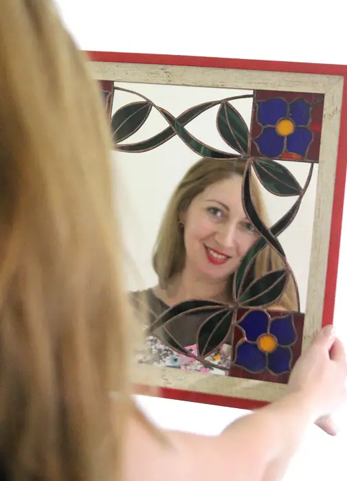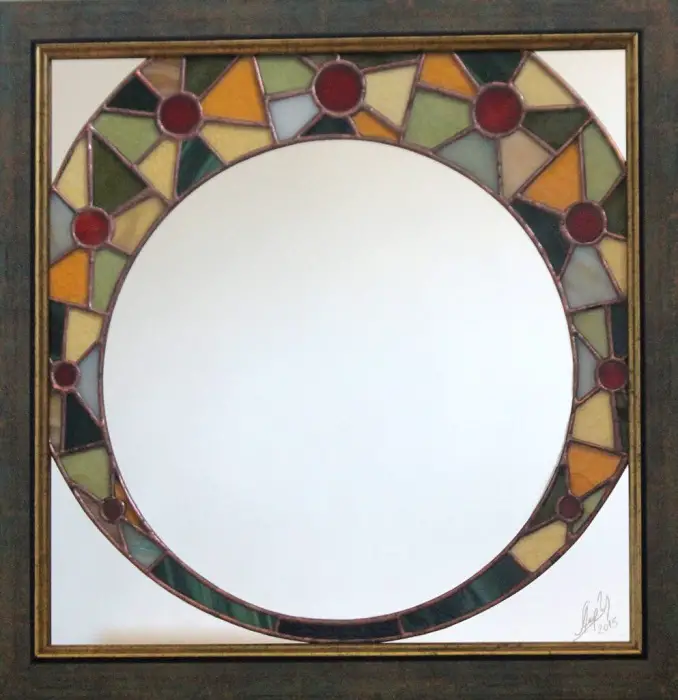 La început vitraliul a fost gândit ca un paspartu între oglindă și rama de lemn. Treptat cadrul strict a fost înlocuit cu desene florale pline de culoare care intră discret în oglindă fără a-i altera scopul inițial. Oglinda rămâne obiect de utilitate devenind în același timp și obiect de artă.