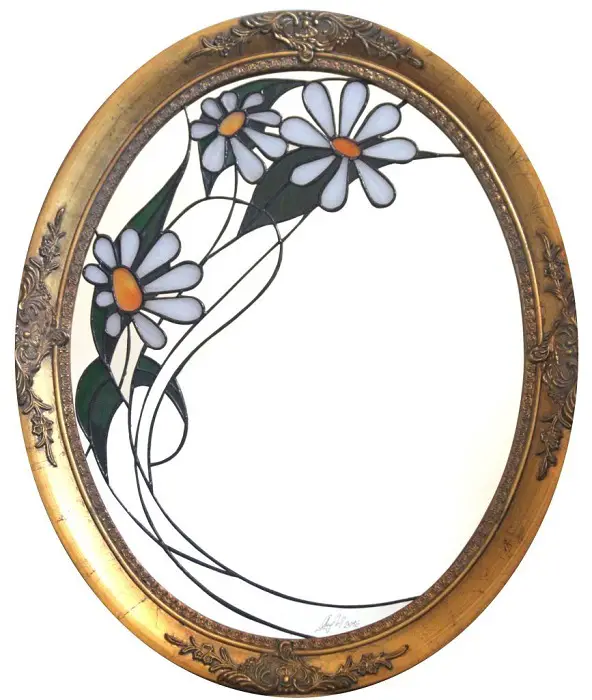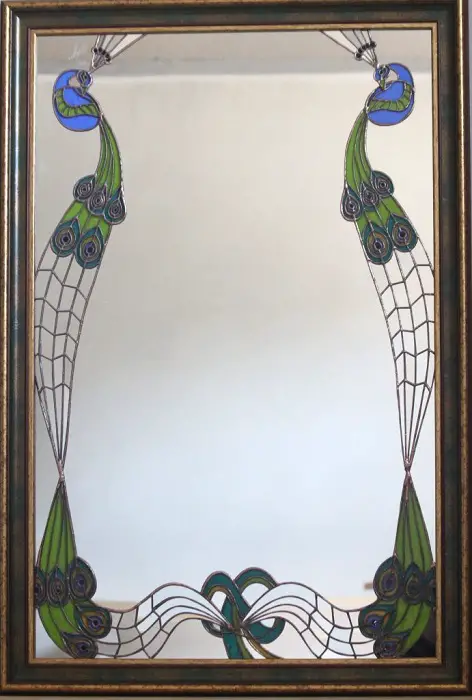 Această combinație oglindă – sticlă – ramă de lemn reprezintă vârful de gamă în domeniu. Oglinzile vitrate sunt piese de artă, certificate de expoziţiile din care au făcut parte, piese de mobilier datorită funcţionalităţii şi esteticii, şi vitralii Tiffany în acelaşi timp.