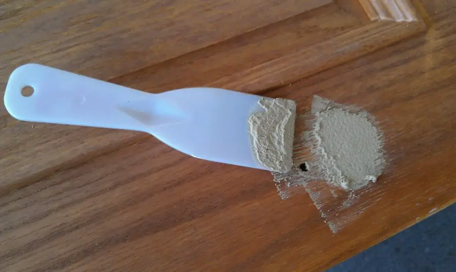 Puteți folosi amestec de aracet cu rumeguș fin de lemn. Aracetul trebuie să fie D3 ca să fie rezistent la abur și umezeală (condiții de bucătărie). Amestecul trebuie să aibă consistența unei mămăligi vârtoase. Acoperiți bine găurile, lăsați să se întărească și șlefuiți pentru a ajunge la nivelul plăcii. Apoi montați balamaua.