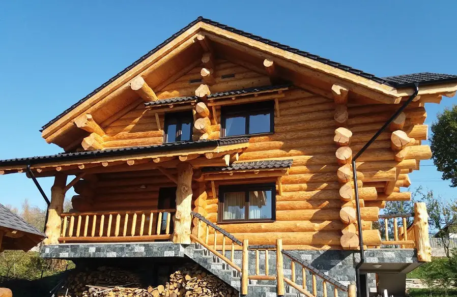 Casele din lemn rotund sau pătrat. Pereții acestor case rezultă din suprapunerea succesiva a grinzilor din lemn sau a buștenilor. Practic peretele, în toată grosimea lui, este din lemn – un izolator termic foarte bun. Prelucrările sau soluțiile constructive sunt astfel alese încât îmbinarea să fie bine realizată și peretele să nu se “desfacă” dacă lemnul se usucă. Între bușteni și grinzi este pus material de izolare (vată minerală, lână, spumă poliuretanică) care crește eficiența izolării. Sunt case calde iarna și răcoroase vara, asigurând confortul celor din interior.