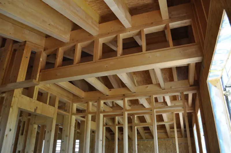 Case pe structură din lemn. Presupun construirea pe șantier a unei structuri din stâlpi, cadre și grinzi din lemn și formarea pereților între elementele de structură, folosind plăci de OSB și materiale izolante. Chiar și dacă nu s-ar pune izolație (ceea ce de obicei nu se întâmplă), iar pereții ar fi doar închiși de-o parte și de alta cu plăci de OSB sau gips carton, stratul de aer din interior ar funcționa ca un izolator termic.