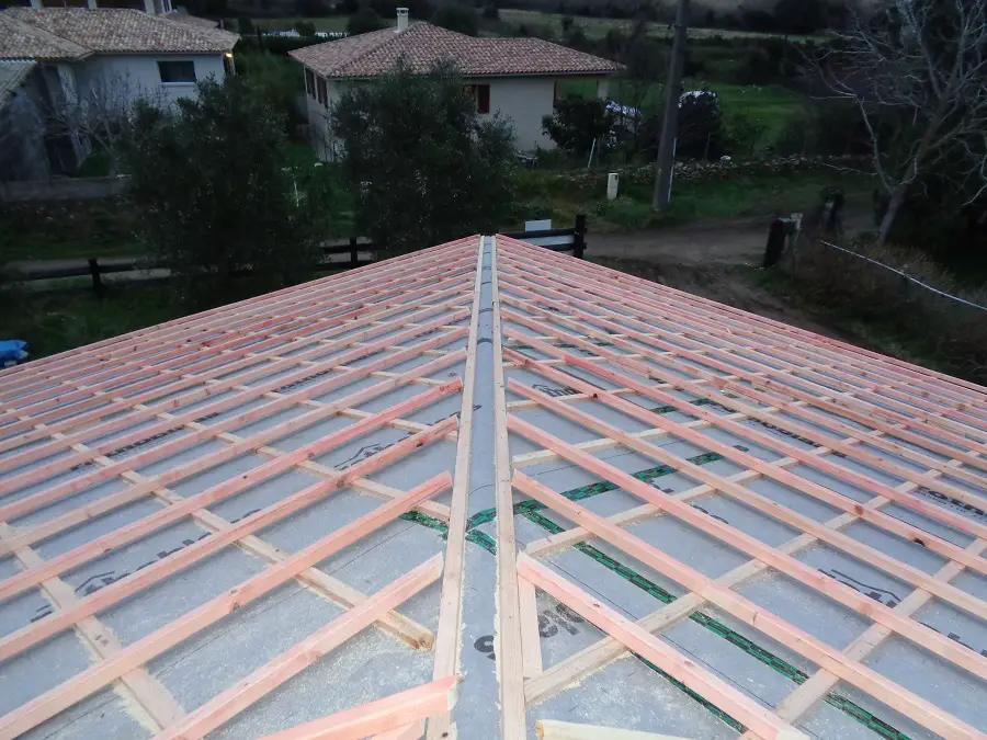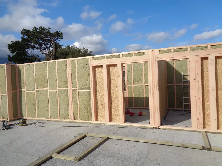 Elementele de construcție obținute în fabrică au fost ambalate, urcate în TIR și transportate în Corsica, unde a început a doua etapă a construcției. Aici, pe fundația deja ridicată de client, s-au montat pereții, foliile anticondens, profilele metalice și elementele acoperișului. Pentru izolarea acoperisului s-a folosit vată bazaltică de 300 mm grosime.