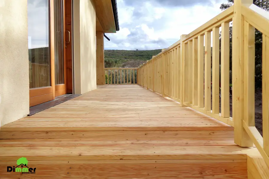 Fiind un parter înalt, accesul se face pe oricare dintre cele două scări din lemn care dau pe terasă. Scările sunt simple, ca și terasa, cu vang central și balustrade tot din lemn. Stâlpii, balustradele, sageacul și tavanul terasei sunt din lemn de molid iar pardoseala din lemn de larice. O parte a terasei nu este acoperită, lăsând lumina să pătrundă în voie în casă.